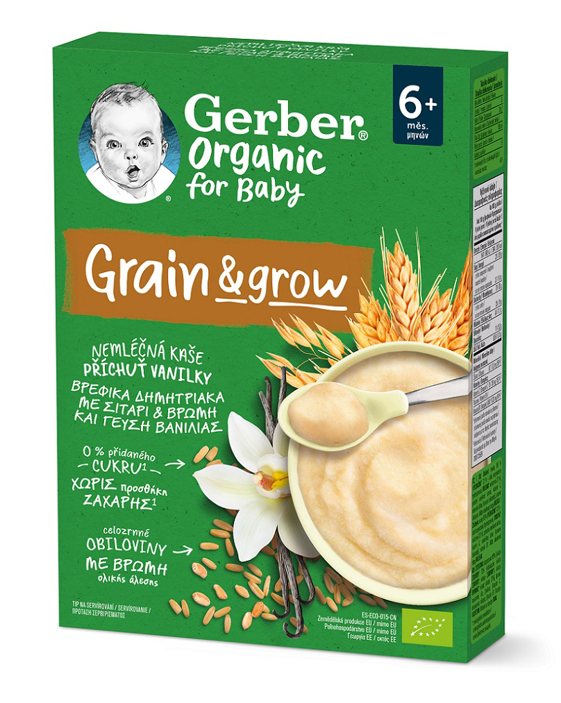 GERBER Organic nemléčná kaše s příchutí vanilky je příkrm určený pro kojence od ukončeného 6. měsíce věku dítěte. kaše kombinují vysoké nároky malých gurmánů na přirozeně nasládlou chuť, která vzniká díky speciálnímu procesu zpracování obilovin. Rodiče ocení snadnou a rychlou přípravu v kterékoli části dne, ať už chystají snídani nebo večeři. Každá lžička obsahuje kombinaci obilovin pěstovaných na certifikovaných organic farmách, kde je brán ohled na přirozený způsob pěstování a dozrávání všech plodin. Grain&Grow přináší do ručky vašeho děťátka to nejlepší ze světa obilovin a výživy. Cereální kaše jsou vhodnou součástí dětského jídelníčku v období zavádění prvních příkrmů. GERBER Organic obilné kaše jsou příkrmy vhodné pro malá bříška již od ukončeného 6. měsíce věku. V každé porci najdete vybrané celozrnné obiloviny, vitamín C a 58 % doporučené denní dávky železa, které přispívá k rozvoji poznávacích funkcí u dětí 0 % přidaného cukru* Grain&Grow přináší to nejlepší z výživy do každé do každé lžičky pouze vybrané obiloviny od BIO certifikovaných farmářů, kteří respektují přirozený řád přírody vitamín C v každé porci 58 % denní doporučené dávky ŽELEZA v každé porci přispívá k rozvoji poznávacích funkcí u dětí *Obsahuje přirozeně se vyskytující cukry Složení: Mouky 99 % (PŠENIČNÁ* 72 % – část enzymaticky hydrolyzovaná, OVESNÁ* celozrnná 27 %), přírodní vanilkové aroma, vitamín C, minerální látka (fumaran železnatý), vitamín (thiamin). Může obsahovat stopy MLÉKA. z ekologického zemědělstvíNakupujte v našem e-shopu za skvělé ceny. Pokud budete spokojeni, doporučte nás prosím svým známým.