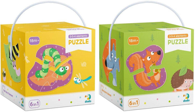 Popis produktu DODO Puzzle 2-3-4 dílků, balení 2 kusů Lesní zvířátka a Brouci, 18m+