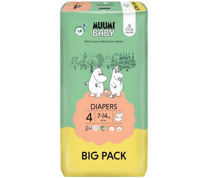 Popis produktu MUUMI Baby 4 Maxi 7–14 kg (69 ks), eko pleny